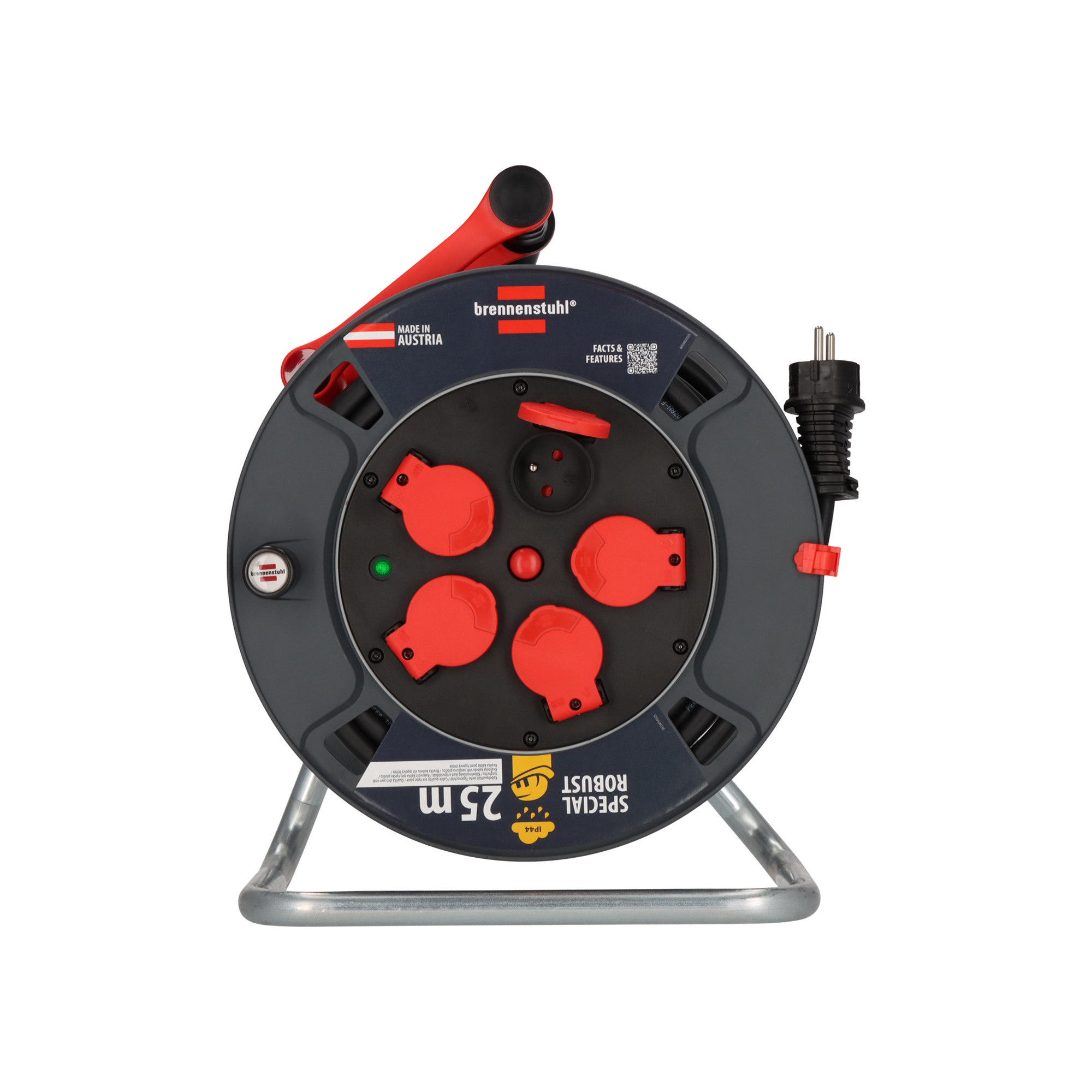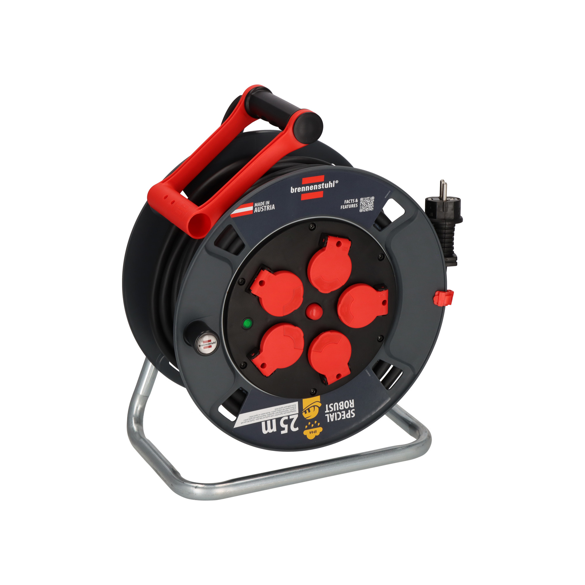 Kabelový buben o délce 25 m s pěti zásuvkami 230 V a ochranou IP44 je ideální pro venkovní použití. Gumový kabel s průřezem 3x2,5 mm zajišťuje vysokou odolnost a bezpečnost díky integrované tepelné pojistce.