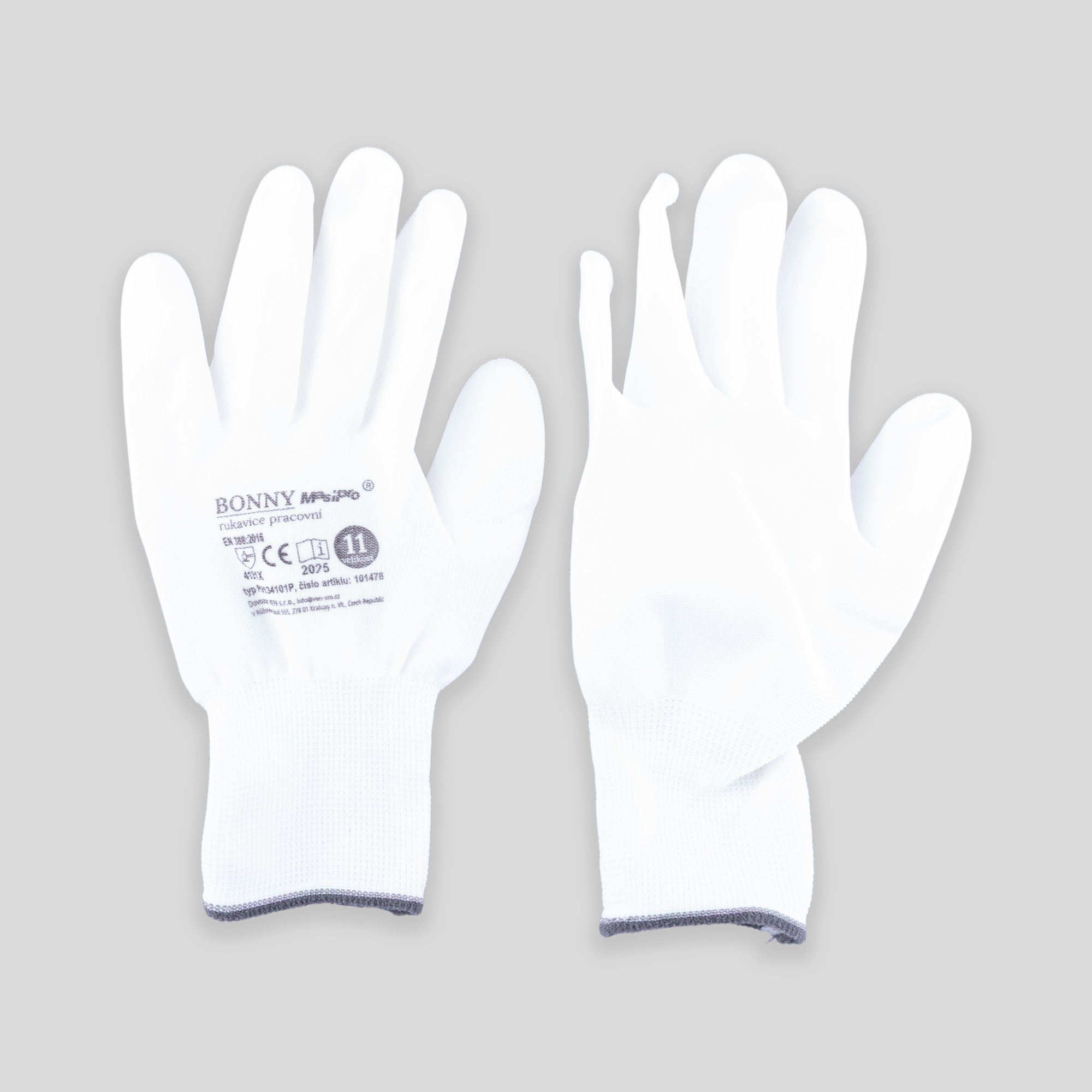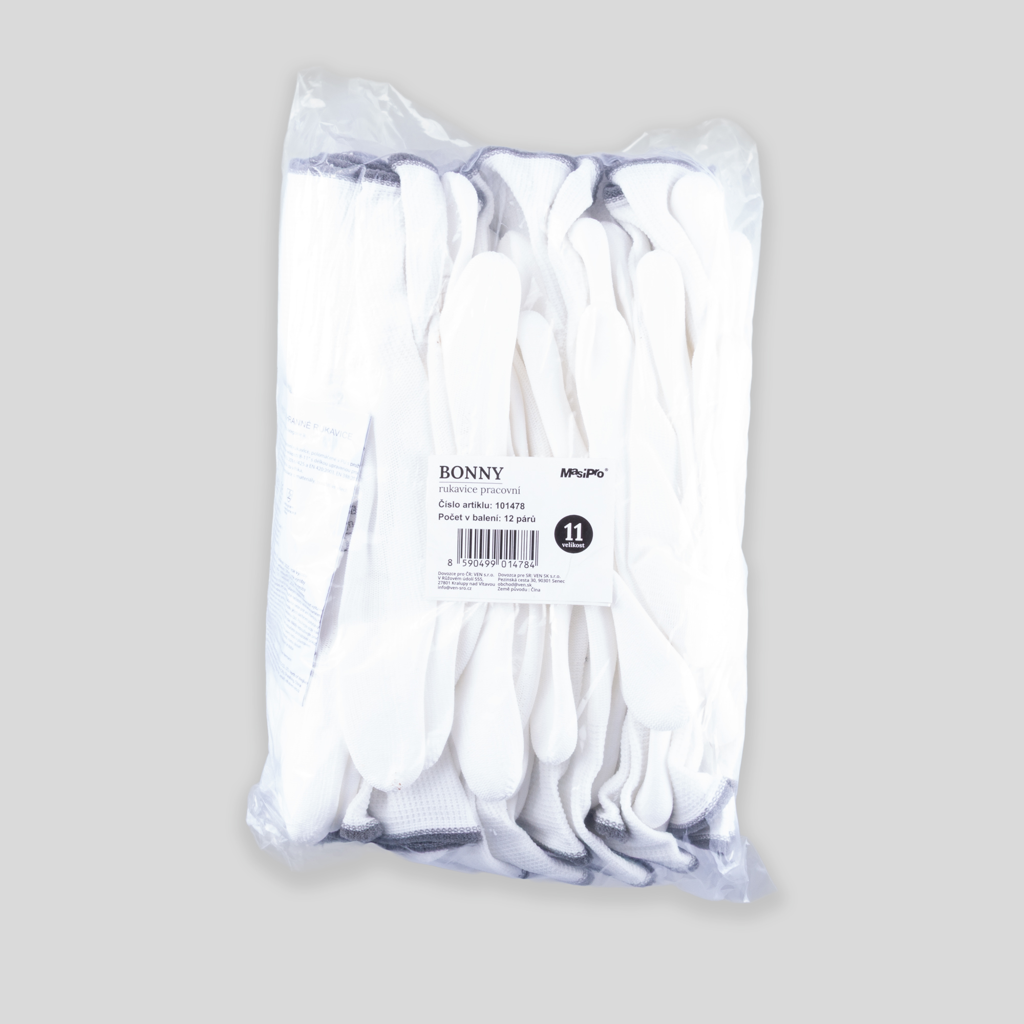 Rukavice BONNY 11" bílé jsou vyrobeny z bezešvého polyesterového úpletu s pružným nápletem na zápěstí a povrstveny tenkou vrstvou polyuretanu, což zajišťuje vysokou odolnost proti oděru a střední odolnost proti řezu. Prodávají se pouze po balení po 12 párech.